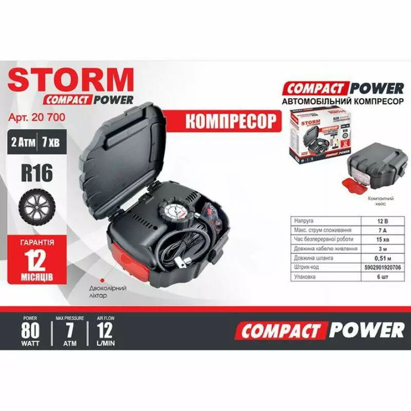 Автокомпрессор однопоршневой от прикуривателя STORM для шин R13-R15 Compact Power 15 л/мин 80 Вт 7Атм (20700)