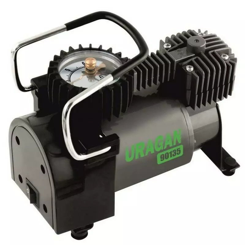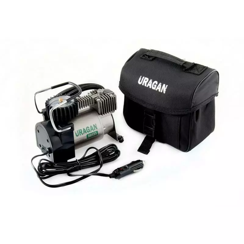 Автокомпрессор однопоршневой от прикуривателя URAGAN автомобильный компрессор с автостопом для шин R13-R16 7Атм 37 л/мин 170Вт (90135)