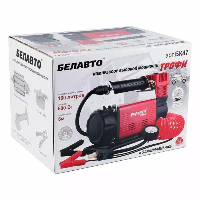 Автомобильный компрессор однопоршневой BelAuto ТРОФИ для накачки шин R13-R22 с защитой от перегрева 10 Атм 160 л/мин 600 Вт (BK47)