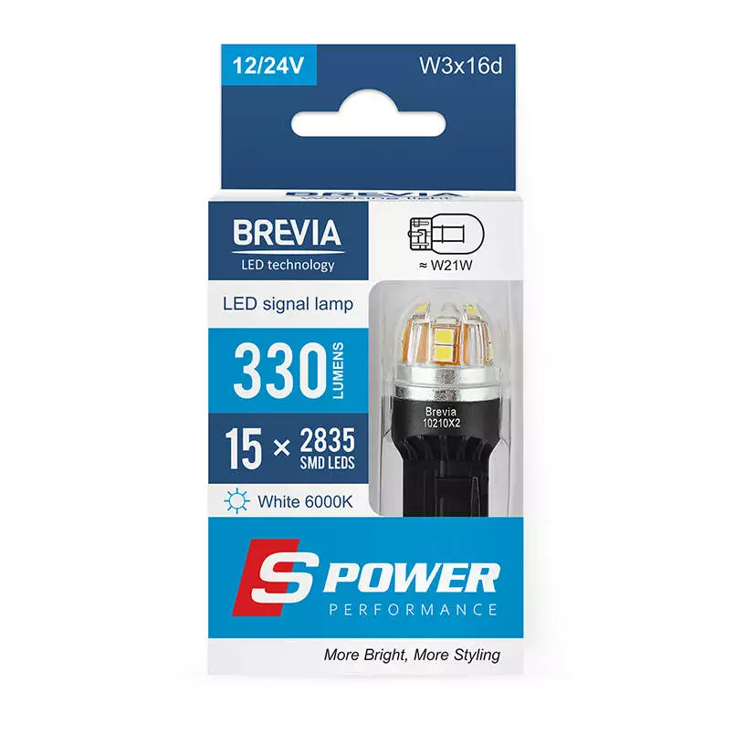 Brevia S-Power W21W 330Lm 15x2835SMD 12/24V CANbus, 2шт (10210X2)