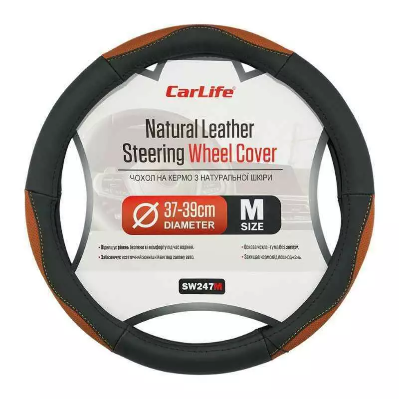 Чехол на руль Carlife 37-39см, кожа, черный с коричн. вставками (SW247M)