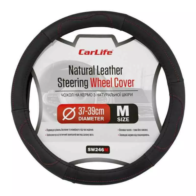 Чехол на руль Carlife 37-39см, кожа, черный с красной ниткой (SW246M)