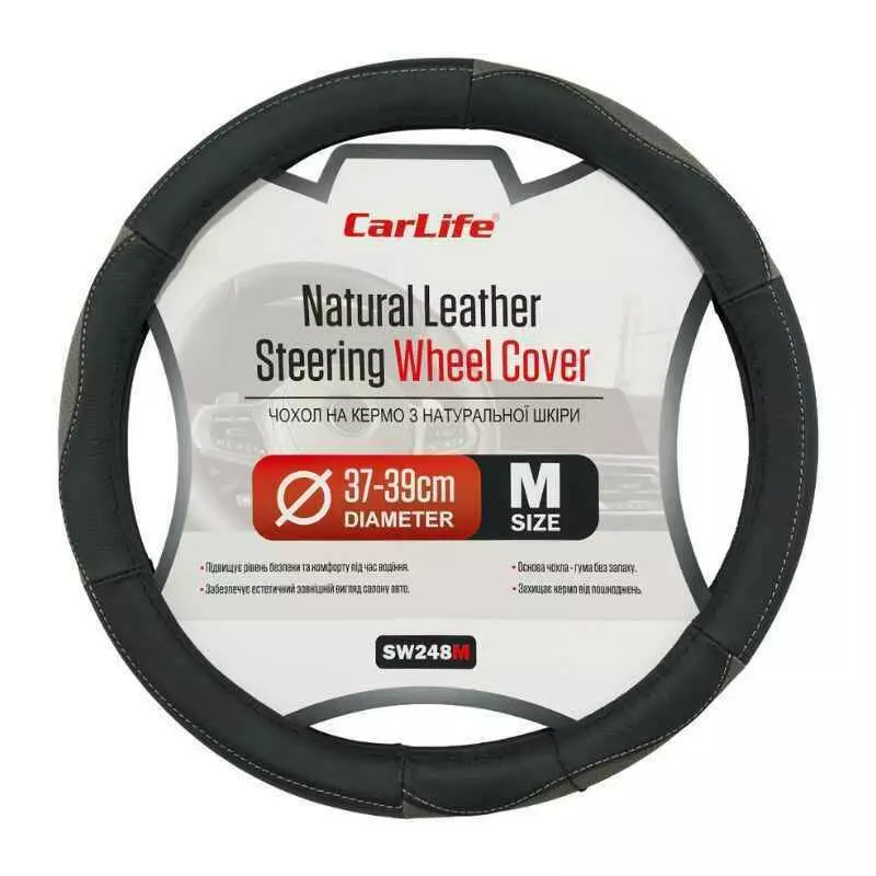 Чехол на руль Carlife 37-39см, кожа, черный с серыми вставками (SW248M)