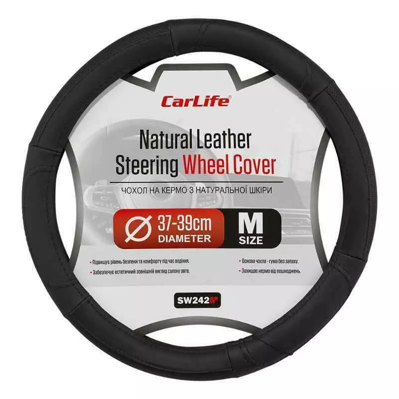 Чехол на руль Carlife 37-39см, кожа, черный (SW242M)