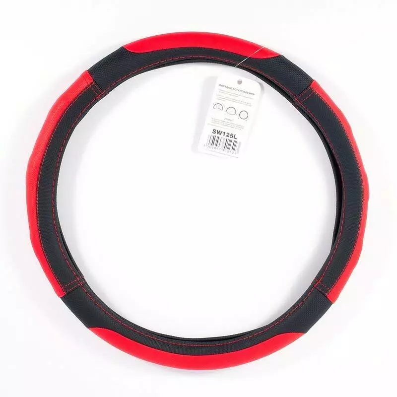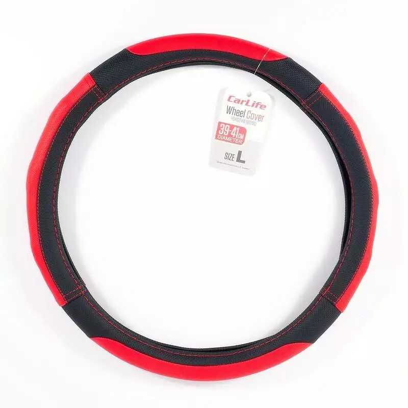 Чехол на руль L (39-41 см) из экокожи и белой резины CARLIFE черный с красными вставками и перфорацией (SW125L)