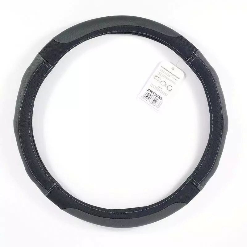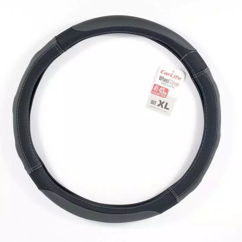 Чехол на руль XL (41-43 см) из экокожи и белой резины CARLIFE черный с серыми вставками и перфорацией (SW126XL)