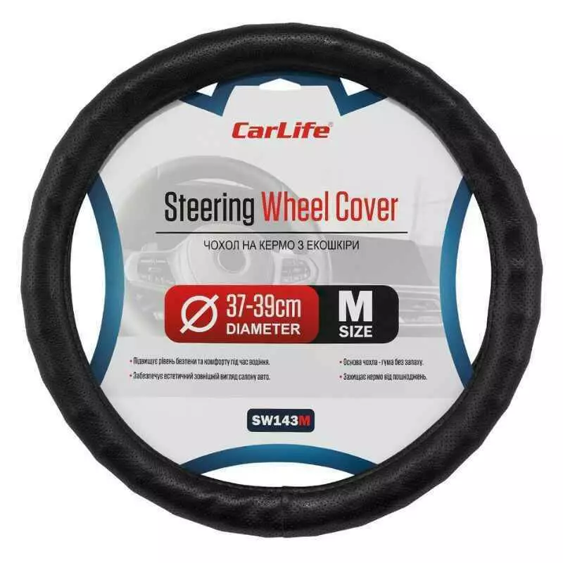 Чохол на кермо Carlife 37-39см, екошкіра, чорний, один шов, перфорований (SW143M)
