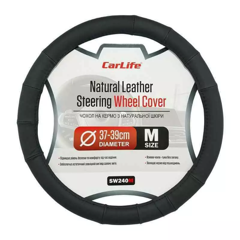 Чохол на кермо Carlife 37-39см, шкіра, чорний (SW240M)