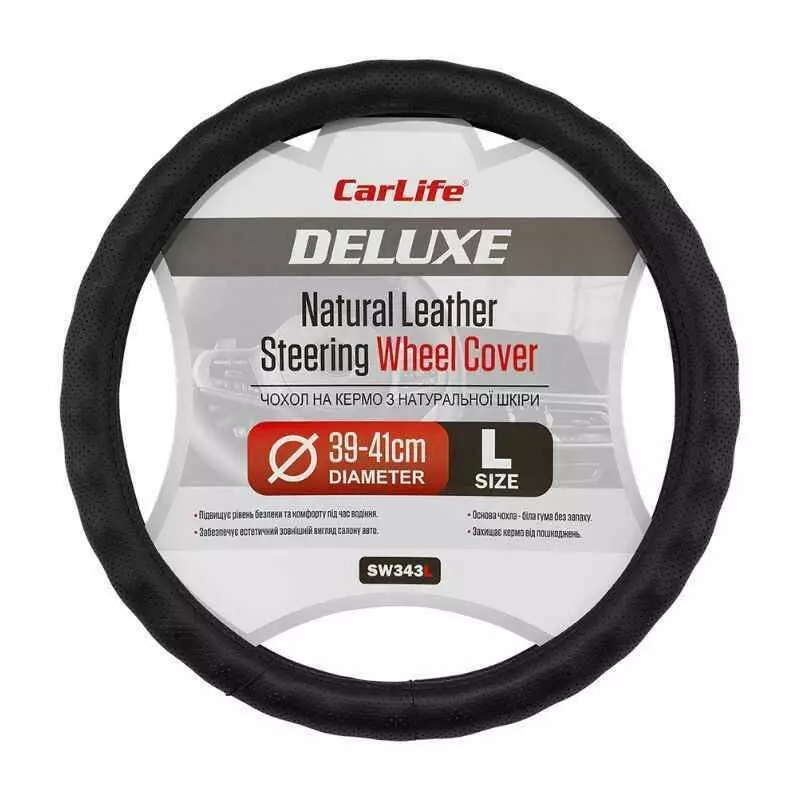 Чохол на кермо Carlife 39-41см, шкіра, чорний, біла гума, один шов, перфорований (SW343L)