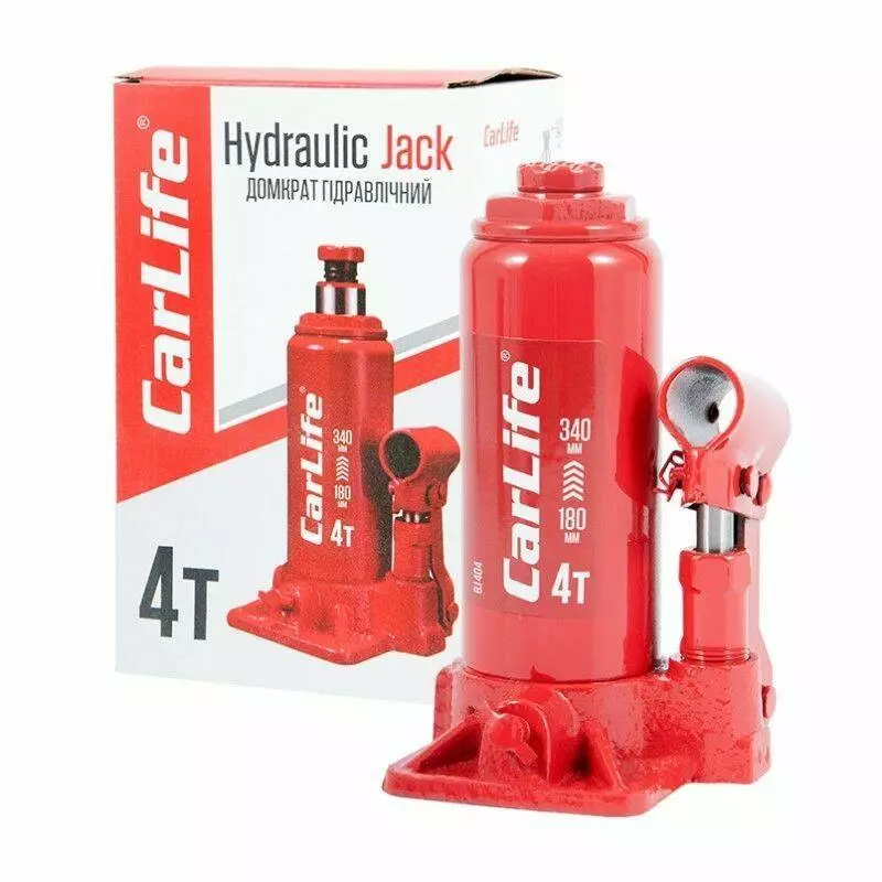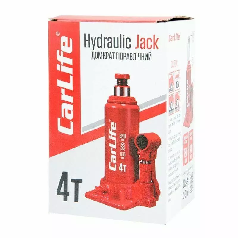 Домкрат гидравлический бутылочный 4т CarLife 180-340мм для автомобиля в картонной упаковке (BJ404)