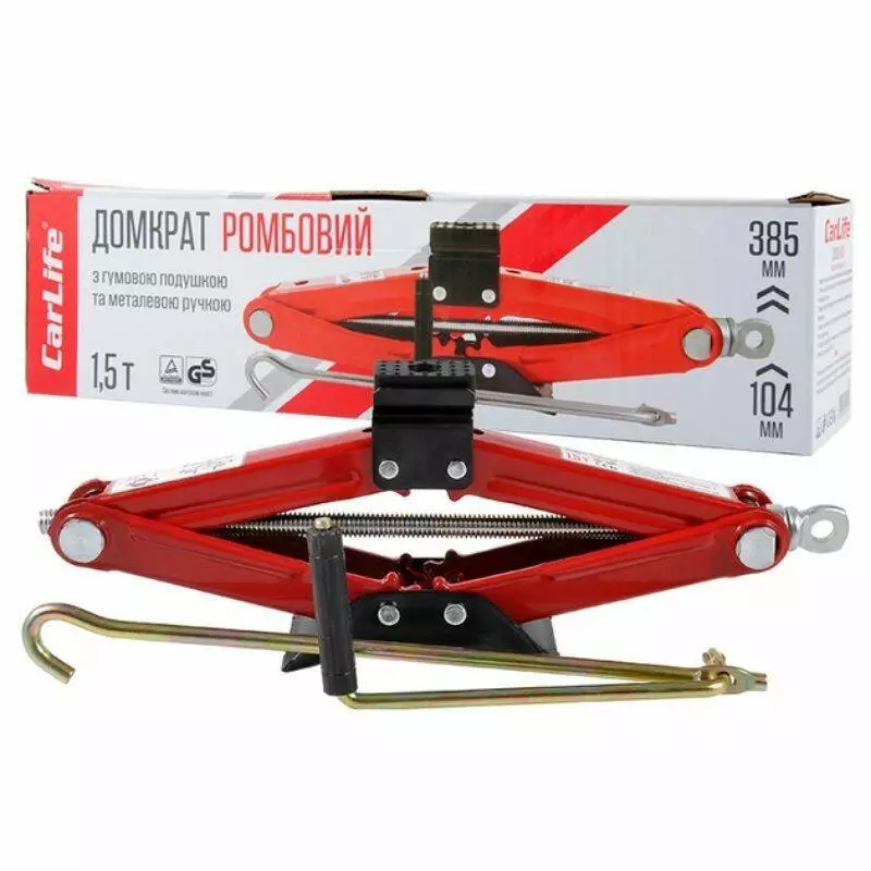 Домкрат механический ромбовидный 1.5т CarLife 104-385мм для автомобиля в картонной упаковке (SJ222)