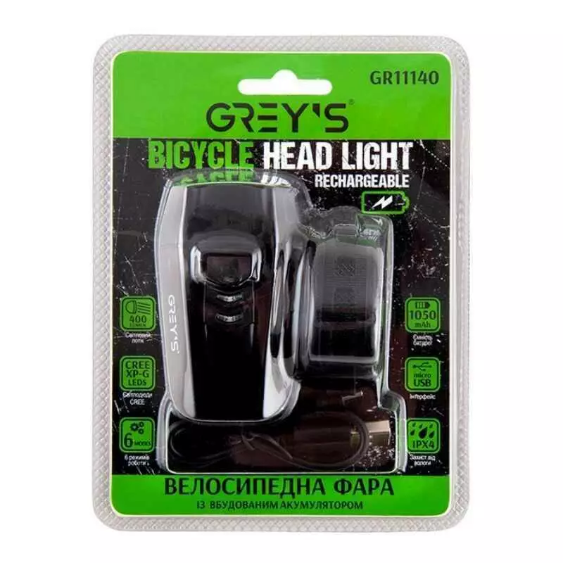 Фара на велосипед на руль 400Lm Grey's 1050mAh IPX4 6 режимов до 8 часов работы (GR11140)