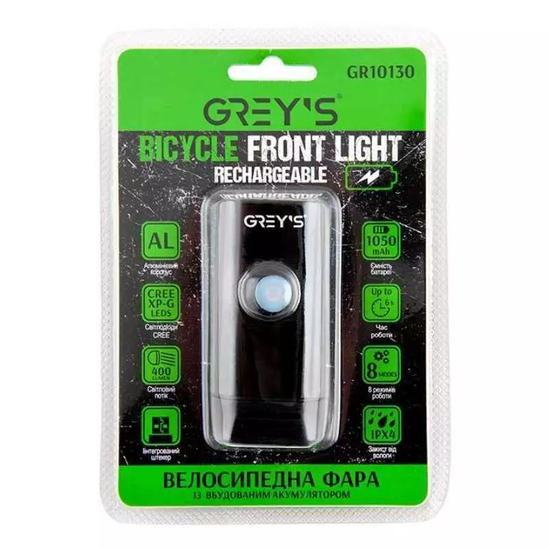 Фара на велосипед на руль 400Lm Grey's 1050mAh IPX4 8 режимов до 6 часов работы (GR10130)