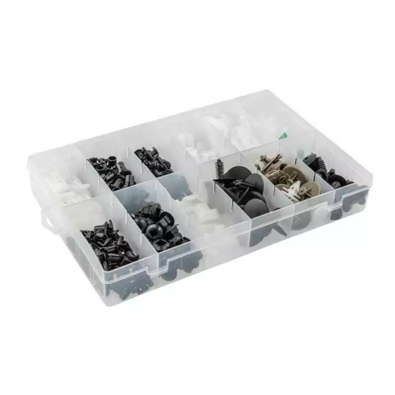 <p>Комплект содержит основные типы клипс, которые используют в креплении обшивки салона, потолка, дверей, багажника, а также элементов кузова. Каждый тип имеет собственное отделение в коробке, что облегчает поиск и хранение. Пластик устойчив к износу, не высыхает и не трескается при монтаже или демонтаже. Благодаря разнообразным цветам можно подобрать оптимальный вариант для разных частей автомобиля.</p>