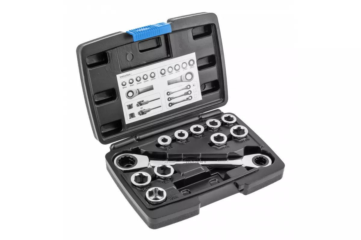 <li><strong>Размеры ключей:</strong> 8 мм, 9 мм, 10 мм, 11 мм, 12 мм, 13 мм, 15 мм, 16 мм, 17 мм, 18 мм, 14 х 19 мм</li>