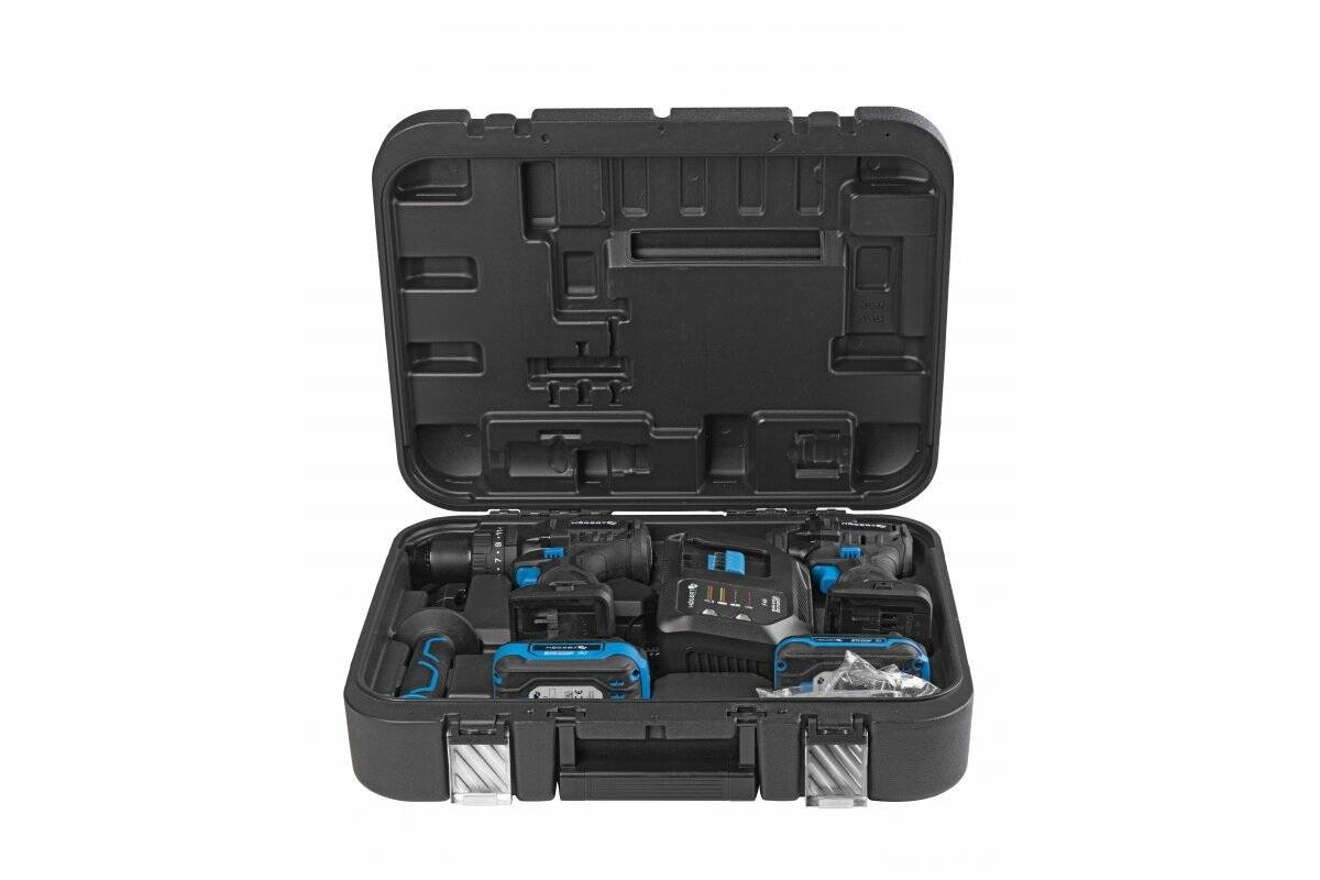 - Комплектація: Акумулятор, гайковерт, дриль-шуруповерт, зарядний пристрій, кейс