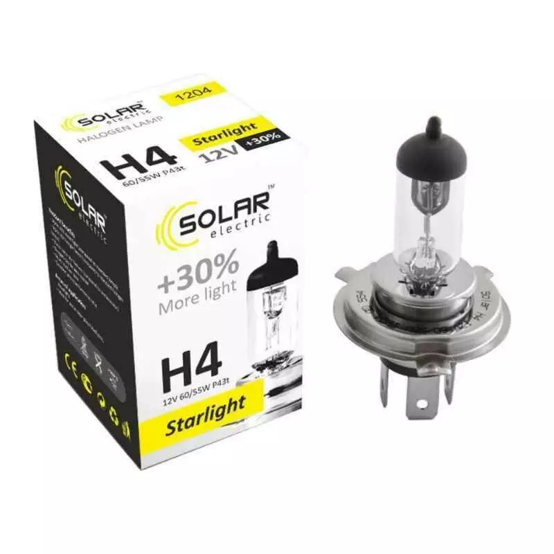 Лампа галогенная Solar H4+30% 12V 1шт (1204)