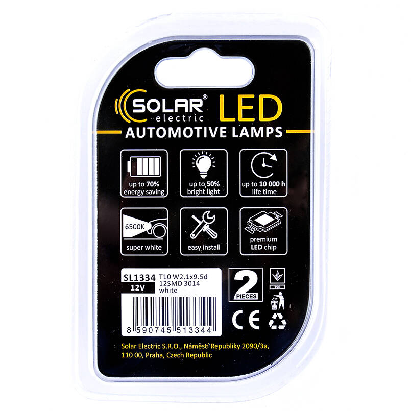 LED автолампа SOLAR 12V T10 W2.1x9.5d 12SMD white, 2шт (SL1334)