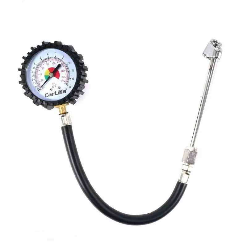 Манометр автомобильный CarLife аналоговый 12 атм гибкий шланг двойной зажим (TG582)
