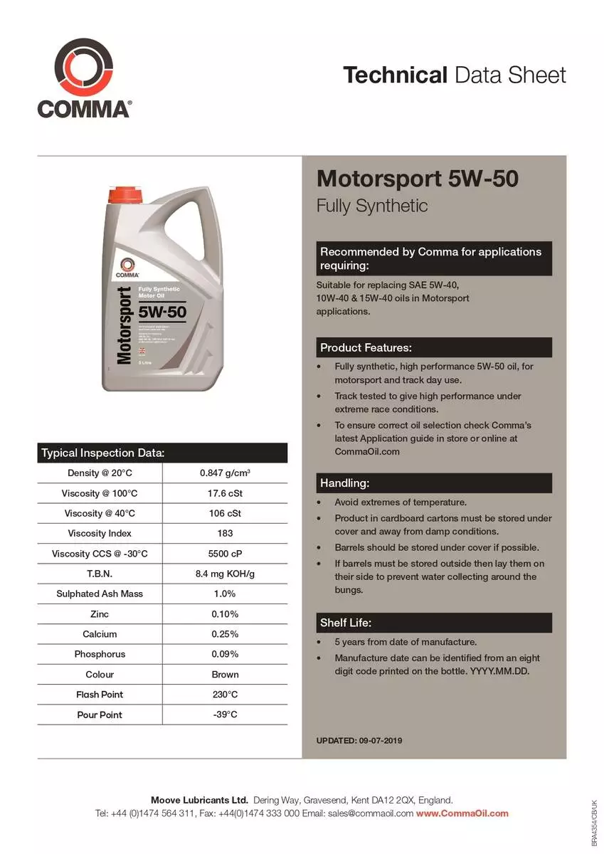 Моторное масло Сomma MOTORSPORT 5W-50 API SL, CF; ACEA A3/B3 5л (4шт/уп)