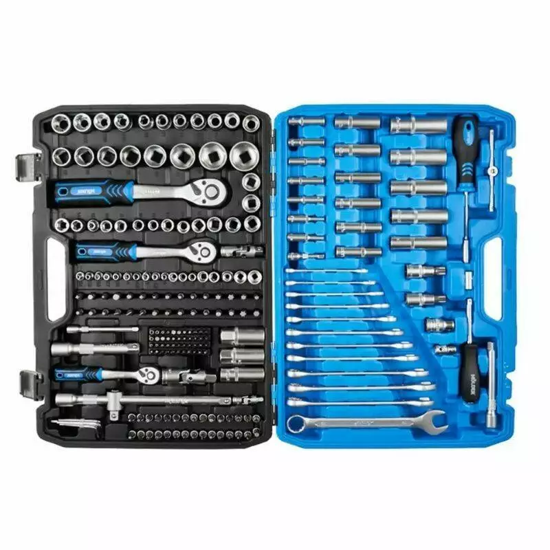 - До набору входить: Адаптери, Торцеві головки, Воротки, Кардани, Свічкові головки, Тримачі біт, Біти, Ключі