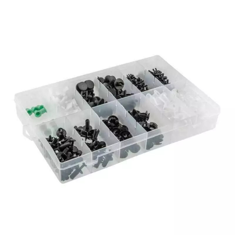 <p>Упорядоченная коробка с 12 отделениями позволяет держать все клипсы под рукой. Это удобно во время ремонта или обслуживания автомобиля. Большое количество элементов подходит для многоразового использования, а разнообразие видов позволяет выполнить большинство работ по фиксации обшивки и пластиковых деталей в салоне и на кузове.</p>