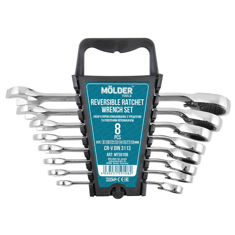 Набор ключей 8 шт комбинированных MOLDER CR-V (8-10-12-13-14-15-17-19 мм) с трещоткой и реверсом (MT59108)