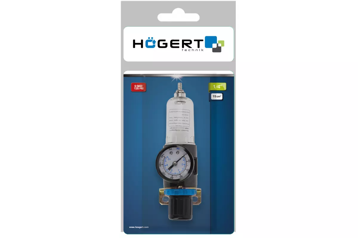 Пневматический фильтр регулятор давления с манометром 1/4 15см³ 9 бар 135 PSI Hogert (HT4R871)