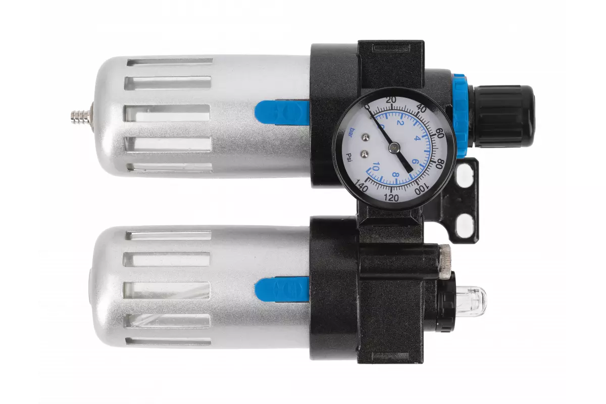 Пневматический фильтр регулятор с манометром и лубрикатором 1/4" 90см³ 60см³ 9бар 135PSI Hogert (HT4R875)
