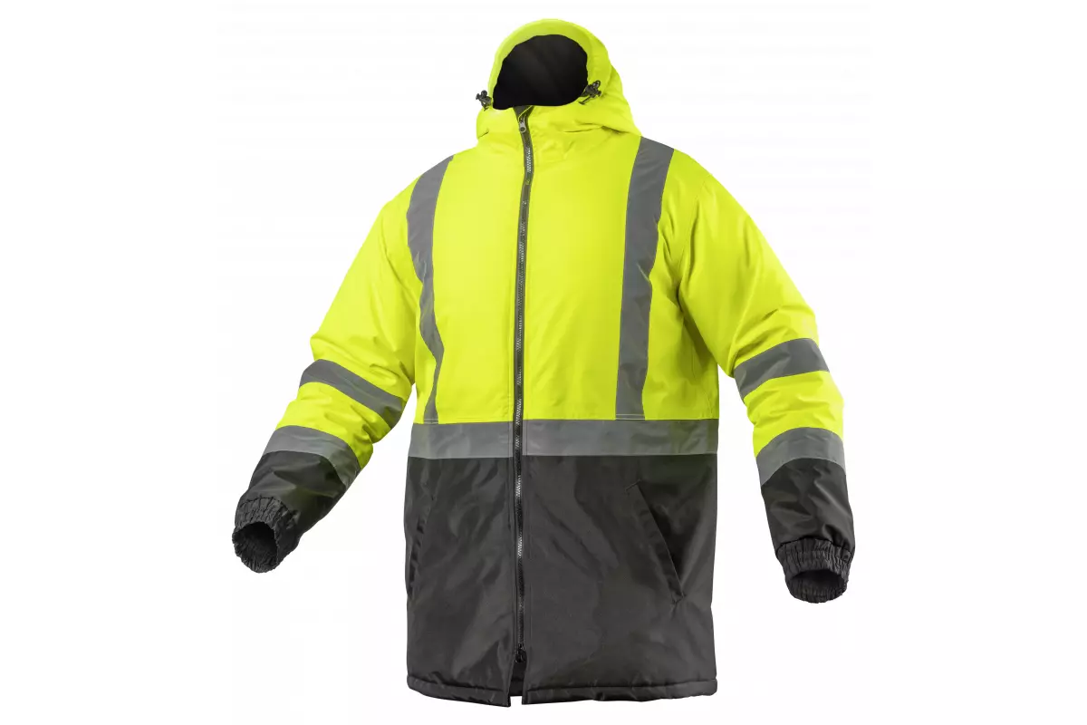 <p>Парка изготовлена из плотной ткани, которая отличается стойкостью к износу. Основной цвет — ярко-желтый с черными вставками, что усиливает видимость. Светоотражающие элементы помогают оставаться заметным в темное время суток или при плохой видимости. Утепление обеспечивает комфорт даже во время работы в холодное время года. Парка подходит для роста от 192 до 200 см.</p>