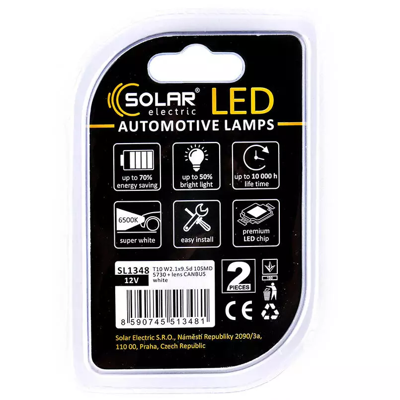 Светодиодные LED автолампы SOLAR Premium Line 12V T10 W2.1x9.5d 10SMD 5730 + lens CANBUS white блистер 2шт (SL1348)
