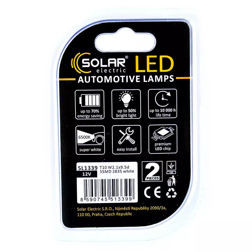 Светодиодные LED автолампы SOLAR Premium Line 12V T10 W2.1x9.5d 5SMD 2835 white блистер 2шт (SL1339)