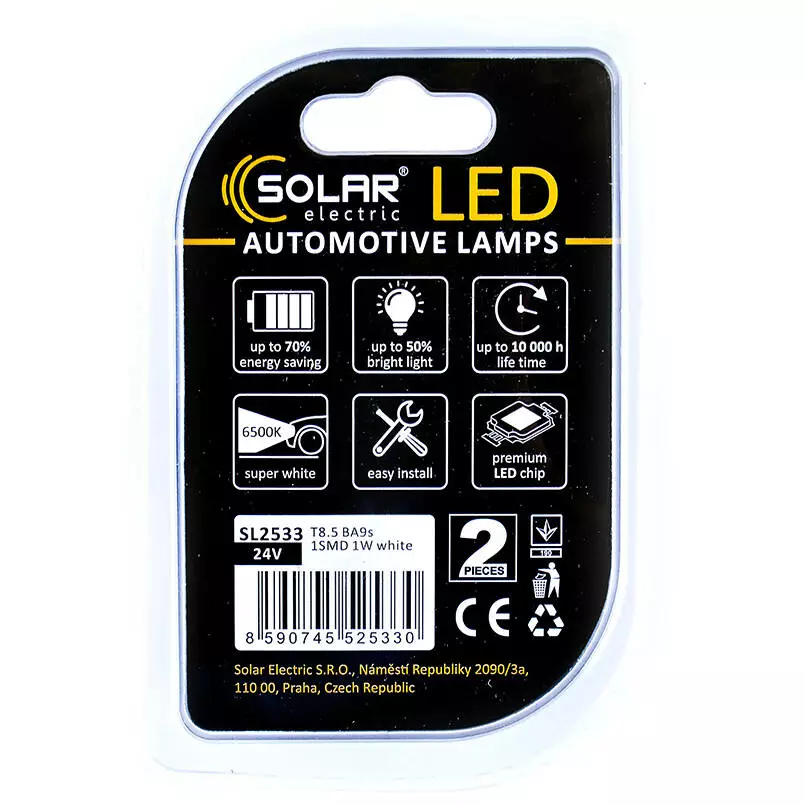 Светодиодные LED автолампы SOLAR Premium Line 24V T8.5 BA9s 1SMD 1W white блистер 2шт (SL2533)