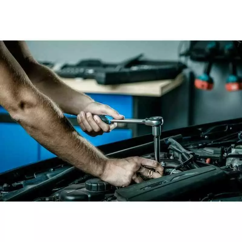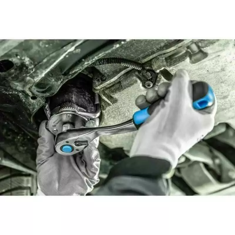 <p>Трещотка оснащена надежным механизмом на 72 зубца. Это позволяет осуществлять равномерное движение даже при малом угле. Кнопка для смены головок расположена так, что её удобно нажимать одной рукой. Рукоятка имеет эргономичную форму, не скользит, даже если руки жирные или в перчатках. Качественное покрытие защищает металл от коррозии.</p>