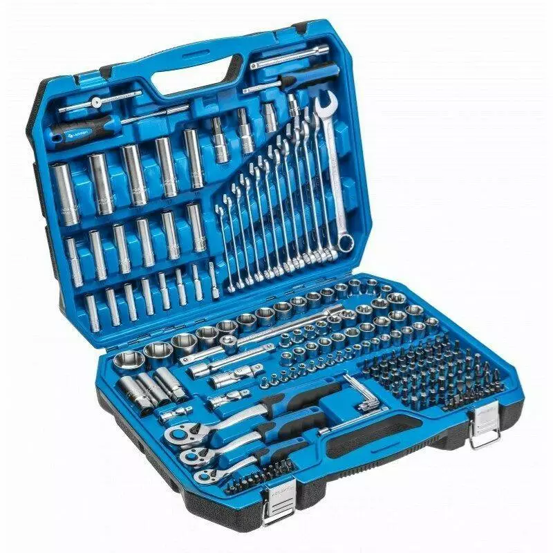 - До набору входить: Адаптери, Торцеві головки, Воротки, Кардани, Свічкові головки, Біти, Викрутки, Ключі
