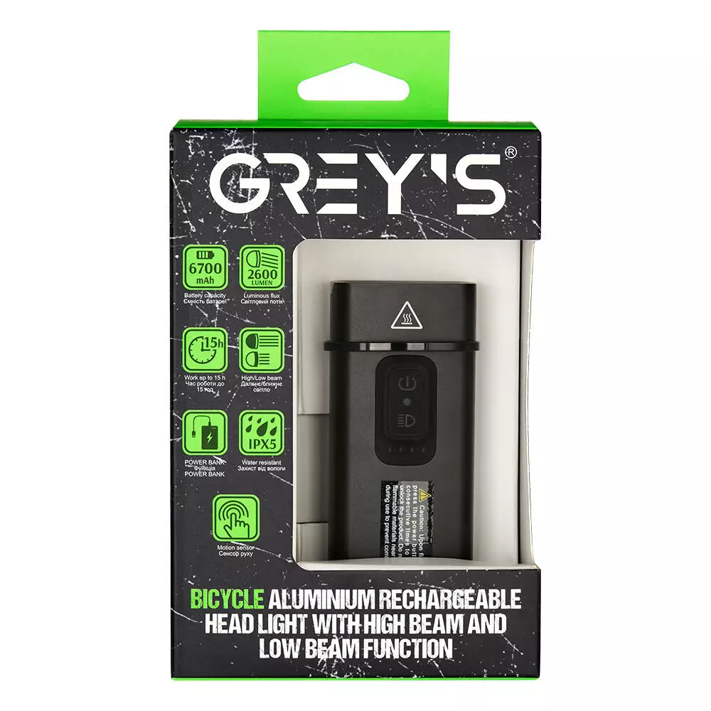 Велосипедна фара GREY'S 2600lm, 6700mAh, режим ближнього і дальнього світла, функція Powerbank GR102