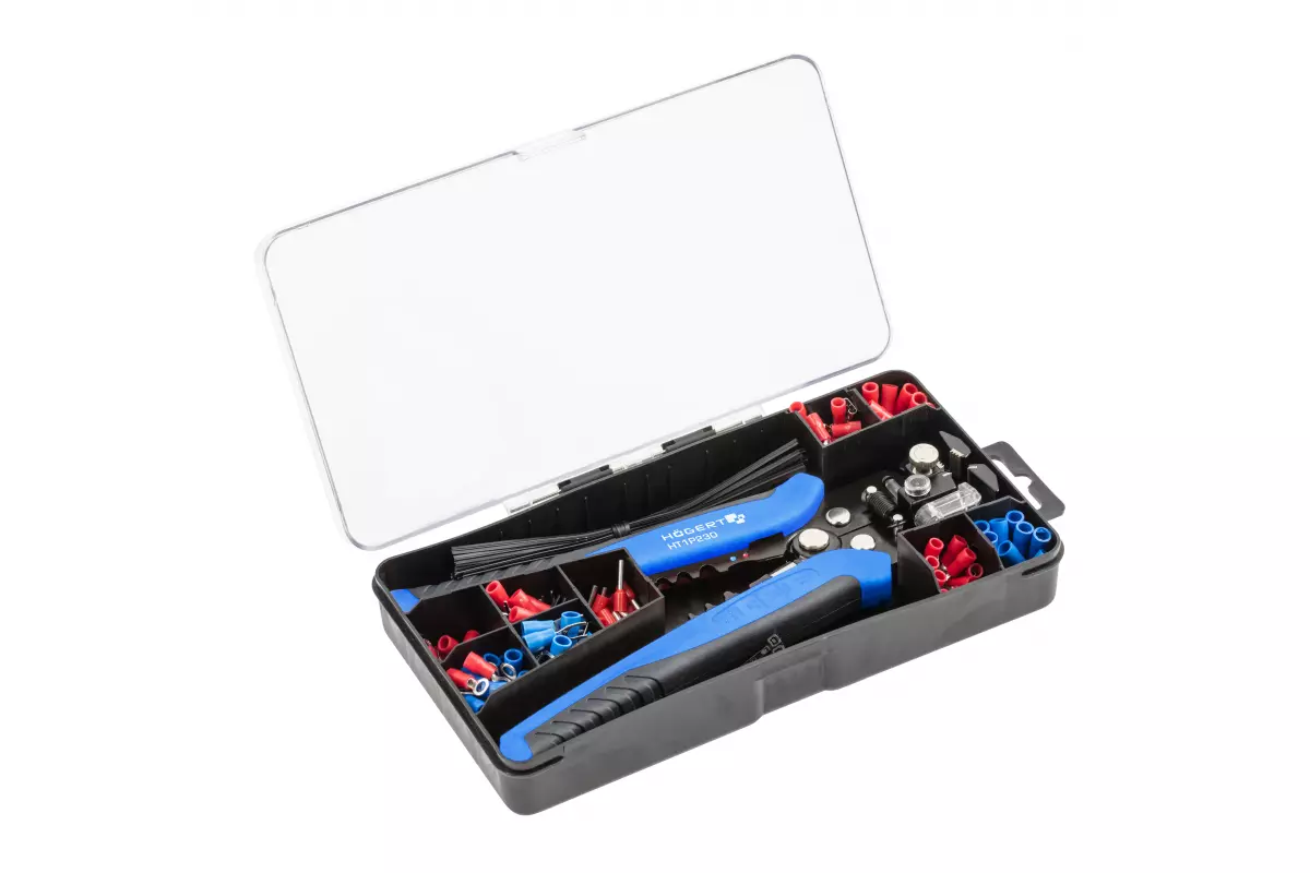 <p>Инструмент подходит для работы с проводами различного диаметра. Благодаря автоматической настройке, стрипперы Hogert HT1P230 быстро адаптируются к толщине провода. Встроенный резак позволяет быстро отрезать провод без смены инструмента. В комплекте есть кейс для транспортировки, что удобно для хранения и перевозки. Наличие 200 клем в комплекте позволяет сразу начать работу и выполнять обжим изолированных и неизолированных наконечников.</p>