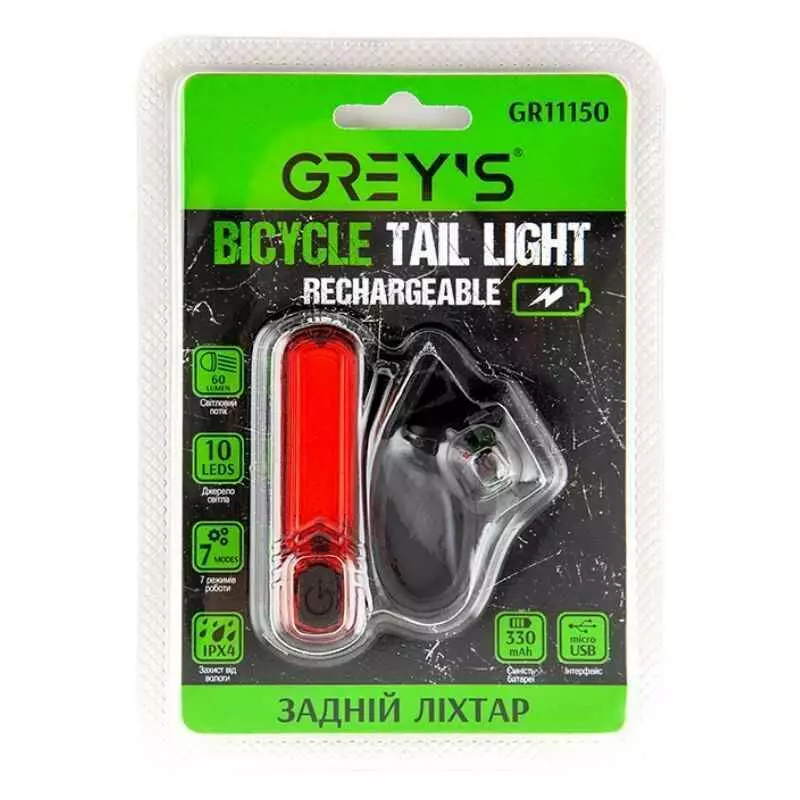 Задний фонарь на велосипед 10 светодиодов 60Lm Grey's 330mAh IPX4 8 режимов до 8 часов работы (GR11150)